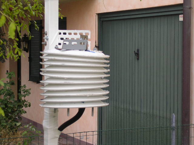 Stazione meteo La Crosse WS 2305 I dati meteo rilevati sono forniti da una stazione meteo amatoriale La Crosse WS 2305; il sensore termo-igrometrico è posizionato all'interno di uno schermo solare autocostruito posto a circa 2 metri di altezza sopra una superficie erbosa distante 2 metri dalla più vicina costruzione (non riscaldata). L'anemometro è invece posizionato a circa 10 metri di altezza, assieme al pluviografo, in luogo aperto in tutte le direzioni. Il